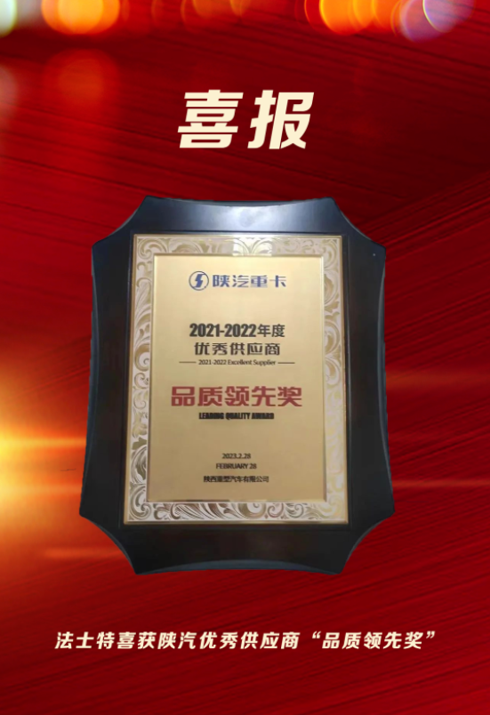 日前,法士特憑借優(yōu)異的產(chǎn)品性能和完善的保障體系,榮獲陜汽重卡2021-2022年度優(yōu)秀供應(yīng)商“品質(zhì)領(lǐng)先獎(jiǎng)”。 質(zhì)量為本 自主創(chuàng)新 持續(xù)改進(jìn) 顧客滿意 2023年,法士特將懷揣著對(duì)產(chǎn)品品質(zhì)的無(wú)限追求和立足市場(chǎng)的產(chǎn)品創(chuàng)新力,繼續(xù)與陜汽攜手并進(jìn),在新產(chǎn)品、新市場(chǎng)、新領(lǐng)域中進(jìn)一步加深合作,搶占先機(jī),互惠共贏!