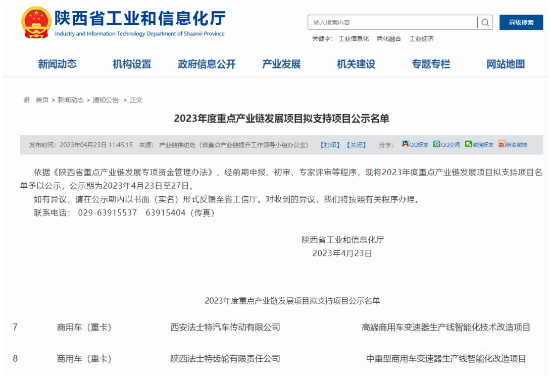 近日,從陜西省工業(yè)和信息化廳傳來(lái)喜訊:西安法士特汽車傳動(dòng)有限公司《高端商用車變速器生產(chǎn)線智能化技術(shù)改造項(xiàng)目》、陜西法士特齒輪有限責(zé)任公司《中重型商用車變速器生產(chǎn)線智能化改造項(xiàng)目》成功入選2023年度全省重點(diǎn)產(chǎn)業(yè)鏈項(xiàng)目。 2023年度重點(diǎn)產(chǎn)業(yè)鏈發(fā)展項(xiàng)目擬支持項(xiàng)目,依據(jù)《陜西省重點(diǎn)產(chǎn)業(yè)鏈發(fā)展專項(xiàng)資金管理辦法》,經(jīng)前期申報(bào)、初審、專家評(píng)審等程序評(píng)選而出。 近年來(lái),法士特始終圍繞汽車產(chǎn)業(yè)鏈,集中優(yōu)質(zhì)資源合力推進(jìn)關(guān)鍵核心技術(shù)攻關(guān),穩(wěn)步提升高端化、智能化、綠色化水平,推動(dòng)企業(yè)數(shù)字化、智能化轉(zhuǎn)型升級(jí),企業(yè)生產(chǎn)經(jīng)營(yíng)穩(wěn)步提升,實(shí)現(xiàn)高質(zhì)量發(fā)展。