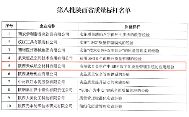 近日,陜西省工業(yè)和信息化廳正式公布第八批陜西省質(zhì)量標(biāo)桿名單。經(jīng)企業(yè)申報(bào)、地市推薦、專家評審等環(huán)節(jié)層層篩選,全省10家企業(yè)獲評,天成航材憑借“高端鈦合金生產(chǎn)中ERP數(shù)字化質(zhì)量管理系統(tǒng)的應(yīng)用經(jīng)驗(yàn)”成為 陜西新材料領(lǐng)域唯一質(zhì)量標(biāo)桿企業(yè)。 天成航材自2007年成立以來,長期承擔(dān)航空、航天、船舶等高技術(shù)領(lǐng)域鈦材科研生產(chǎn)任務(wù),并充分利用現(xiàn)代化信息技術(shù)優(yōu)勢,以智能化、自動化技術(shù)改造傳統(tǒng)產(chǎn)業(yè)。 公司逐步建立完善了 ERP數(shù)字化質(zhì)量管理系統(tǒng) 的設(shè)計(jì)、改良和應(yīng)用,實(shí)現(xiàn)成本引領(lǐng)、精準(zhǔn)控制、綜合管理、深度挖潛的產(chǎn)品質(zhì)量創(chuàng)新管理模式,兼顧鈦合金產(chǎn)品質(zhì)量與生產(chǎn)效率,實(shí)現(xiàn)了企業(yè)管理水平的大幅提升。 據(jù)了解,陜西省工業(yè)和信息化廳舉辦質(zhì)量標(biāo)桿評選活動,旨在加強(qiáng)工業(yè)質(zhì)量品牌建設(shè),引導(dǎo)企業(yè)“學(xué)標(biāo)桿、做標(biāo)桿、超標(biāo)桿”,建立健全質(zhì)量體系,全面提升全省企業(yè)質(zhì)量管理水平。此次榮獲2021年全省質(zhì)量標(biāo)桿,是省工信廳對天成航材質(zhì)量管理水平的高度認(rèn)可和肯定,對公司未來質(zhì)量創(chuàng)新和產(chǎn)品轉(zhuǎn)型意義重大。 未來,天成航材也將 深入做好質(zhì)量創(chuàng)新,持續(xù)探索企業(yè)特色管理模式 ,切實(shí)發(fā)揮好“質(zhì)量標(biāo)桿”的引領(lǐng)作用。