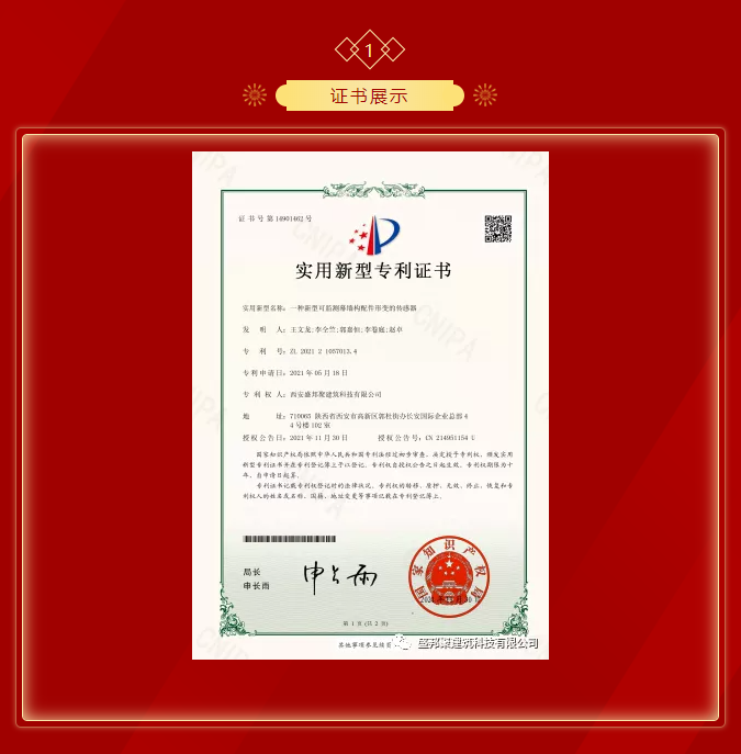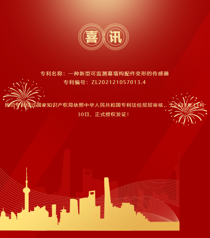 喜訊 | 熱烈祝賀我盛邦聚建筑科技有限公司成功獲取首項實用新型專利——一種新型可監(jiān)測幕墻構(gòu)配件變形的傳感器