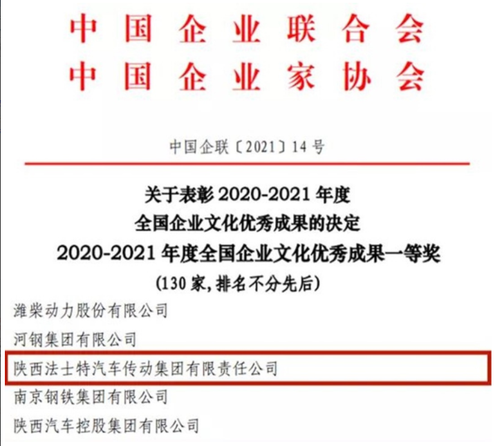 日前,中國企業(yè)聯(lián)合會、中國企業(yè)家協(xié)會聯(lián)合發(fā)文表彰全國企業(yè)文化優(yōu)秀成果。法士特集團再次榮登榜單,法士特創(chuàng)新文化喜獲2020-2021年度全國企業(yè)文化優(yōu)秀成果一等獎。