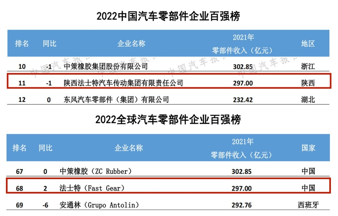 9月22日,《中國汽車報(bào)》社舉行線上發(fā)布會(huì),發(fā)布了2022年全球汽車零部件企業(yè)百強(qiáng)榜和中國汽車零部件企業(yè)百強(qiáng)榜。法士特集團(tuán)同時(shí)入圍“雙百強(qiáng)”榜單,位列“2022中國汽車零部件百強(qiáng)企業(yè)”第11位,“2022全球汽車零部件百強(qiáng)企業(yè)”第68位。 法士特集團(tuán)始終堅(jiān)持“民族品牌、世界品質(zhì)”理念,自主研發(fā)推出的AT、AMT、液力緩速器及新能源汽車傳動(dòng)系統(tǒng)等智能化產(chǎn)品,在品牌效應(yīng)、質(zhì)量性能、節(jié)能環(huán)保等方面競爭優(yōu)勢突出。法士特變速器年產(chǎn)銷量超120萬臺(tái),產(chǎn)品廣泛出口美國、日本、澳大利亞等十多個(gè)國家和地區(qū)。未來,法士特將圍繞高質(zhì)量發(fā)展主線,全力打造國際一流企業(yè),為實(shí)現(xiàn)汽車強(qiáng)國夢(mèng)貢獻(xiàn)力量。 據(jù)悉,2022年,《中國汽車報(bào)》社歷時(shí)3個(gè)月、對(duì)近300家企業(yè)的數(shù)據(jù)進(jìn)行收集與核準(zhǔn),最終完成了榜單排名。