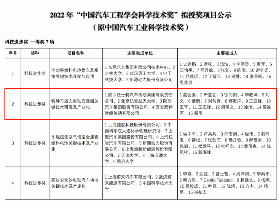 近日,中國汽車工程學會發(fā)布了2022年“中國汽車工程學會科學技術(shù)獎”公示名單。其中,法士特集團申報項目“特種車液力自動變速器關(guān)鍵技術(shù)研發(fā)及產(chǎn)業(yè)化”榮獲科技進步獎一等獎。 據(jù)了解,“中國汽車工程學會科學技術(shù)獎”是首個經(jīng)國家科技獎勵辦公室登記批準的社會力量承辦獎項,是唯一面向全國汽車工業(yè)的科學技術(shù)獎。該獎項已成為我國汽車行業(yè)規(guī)格最高、最具權(quán)威、最有影響力的科技獎項。 近年來,法士特堅持對液力自動變速器關(guān)鍵技術(shù)進行全方位的獨立自主研發(fā),產(chǎn)品性能和技術(shù)含量均達到國際領(lǐng)先水平,并獲多項專利技術(shù),出口多個國家,打破了國內(nèi)中、重型液力自動變速器長期依賴進口的被動局面,全面滿足了國內(nèi)商用車用戶多樣化的選擇。