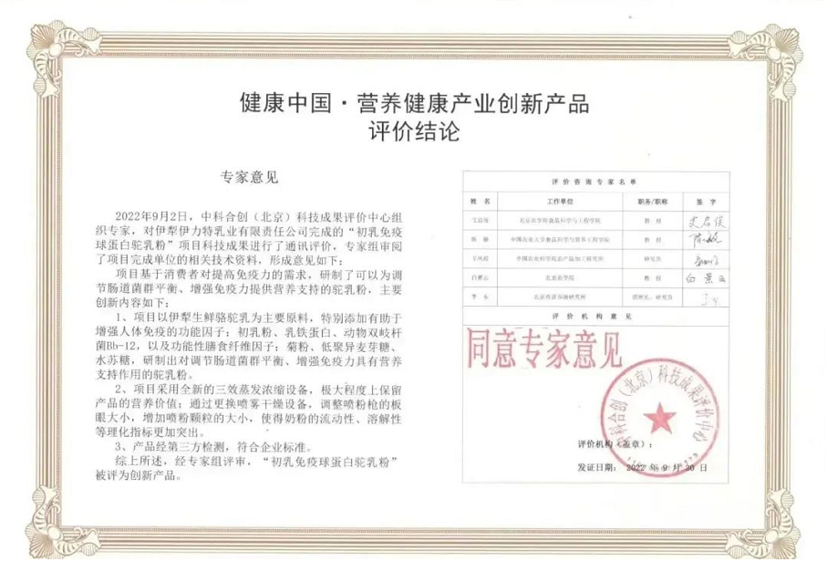 近日,由伊犁伊力特乳業(yè)生產(chǎn)的初乳免疫球蛋白駝乳粉被國(guó)家科技部中科合創(chuàng)(北京)科技成果評(píng)價(jià)中心評(píng)為“健康中國(guó)·營(yíng)養(yǎng)健康產(chǎn)業(yè)創(chuàng)新產(chǎn)品”。 科學(xué)技術(shù)成果評(píng)價(jià)是行業(yè)公認(rèn)的權(quán)威評(píng)價(jià),評(píng)價(jià)委員會(huì)成員均為行業(yè)內(nèi)權(quán)威的技術(shù)專家。經(jīng)評(píng)價(jià)委員會(huì)專家組嚴(yán)格質(zhì)詢、認(rèn)真審查得出的專業(yè)評(píng)價(jià)結(jié)論公信力強(qiáng)、認(rèn)可度高。通過(guò)科技成果評(píng)價(jià),獲取國(guó)家認(rèn)可的成果評(píng)價(jià)證書(shū)以及權(quán)威性的科技評(píng)價(jià)報(bào)告,標(biāo)志著伊犁伊力特乳業(yè)在特色乳產(chǎn)品研發(fā)領(lǐng)域獲得又一重大性突破。 初乳免疫球蛋白駝乳粉精選伊犁生鮮駱駝乳為主要原料,通過(guò)大量的市場(chǎng)調(diào)研、重復(fù)試驗(yàn),特別添加增強(qiáng)人體免疫的功能因子:初乳粉、乳鐵蛋白、動(dòng)物雙歧桿菌Bb-12;功能性膳食纖維因子:菊粉、低聚麥芽糖、水蘇糖等營(yíng)養(yǎng)物質(zhì)。采用先進(jìn)的生產(chǎn)設(shè)備,極大程度上保留產(chǎn)品的營(yíng)養(yǎng)價(jià)值。其憑借優(yōu)良的品質(zhì)和豐富的營(yíng)養(yǎng)價(jià)值,受到消費(fèi)者的一致好評(píng)! 新冠肺炎疫情在全球爆發(fā),大眾消費(fèi)者對(duì)免疫力保護(hù)尤為關(guān)注,合理膳食,提高免疫力,一直是人們倡導(dǎo)的健康生活方式。如何提高免疫力,成為關(guān)注的焦點(diǎn)。初乳免疫球蛋白駝乳粉的創(chuàng)新研發(fā),促進(jìn)科研成果轉(zhuǎn)化,推動(dòng)核心技術(shù)實(shí)現(xiàn)重大突破,提升了中國(guó)特色乳行業(yè)的創(chuàng)新研發(fā)水平和科研進(jìn)程,為大眾消費(fèi)者營(yíng)養(yǎng)攝入樹(shù)立了新旗幟。 滿足多元化乳制品需求,持續(xù)深化全球創(chuàng)新協(xié)同。伊犁伊力特乳業(yè)六十余年來(lái)專注特色乳研究,在產(chǎn)品研發(fā)和生產(chǎn)工藝方面持續(xù)創(chuàng)新,大力提高技術(shù)研發(fā)基礎(chǔ)設(shè)施和生產(chǎn)設(shè)備條件,引領(lǐng)特色乳行業(yè)發(fā)展趨勢(shì),把科技的力量轉(zhuǎn)化為鑄就消費(fèi)者健康的堡壘!