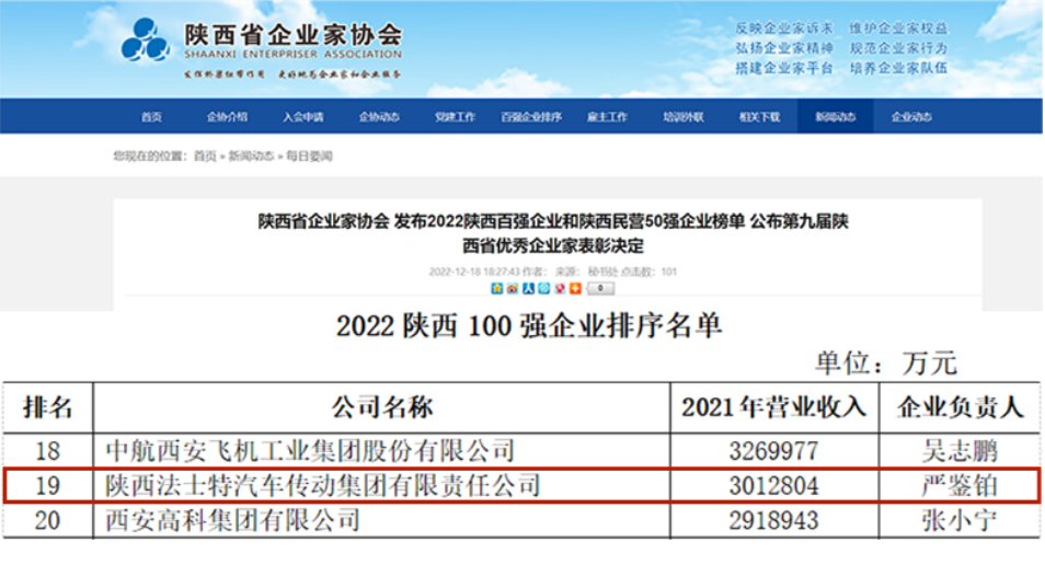 12月18日,陜西省企業(yè)家協(xié)會(huì)發(fā)布2022陜西百?gòu)?qiáng)企業(yè)和陜西民營(yíng)50強(qiáng)企業(yè)榜單,公布第九屆陜西省優(yōu)秀企業(yè)家表彰決定。陜西法士特汽車傳動(dòng)集團(tuán)有限責(zé)任公司榮登陜西百?gòu)?qiáng)榜單第19位,法士特集團(tuán)總經(jīng)理馬旭耀獲評(píng)“第九屆陜西省優(yōu)秀企業(yè)家”。 2021年,法士特聚焦主業(yè),持續(xù)改革創(chuàng)新發(fā)展,推動(dòng)數(shù)字化轉(zhuǎn)型,實(shí)現(xiàn)穩(wěn)定增長(zhǎng),彰顯國(guó)企擔(dān)當(dāng)。未來,法士特將搶抓市場(chǎng)機(jī)遇,堅(jiān)持創(chuàng)新發(fā)展,加快核心技術(shù)攻關(guān),為陜西經(jīng)濟(jì)高質(zhì)量發(fā)展貢獻(xiàn)力量。 此次名單的發(fā)布旨在倡導(dǎo)時(shí)代精神,鼓勵(lì)企業(yè)家攻堅(jiān)克難,奮力拼搏,為陜西省經(jīng)濟(jì)社會(huì)發(fā)展做出新的貢獻(xiàn)。